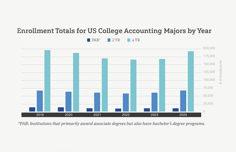 Accounting enrollment is rebounding nationally. According to data from the National Student Clearinghouse Research Center, undergraduate accounting programs saw a 12% increase in fall 2024 compared to fall 2023, bringing enrollment to approximately 266,840 students, the highest since 2020. Spring 2025 data show similar growth, with enrollment jumping 12% year-over-year to 266,507, including a 24% rise at two-year institutions (77,936 students) and an 11% rise at four-year schools (188,571).